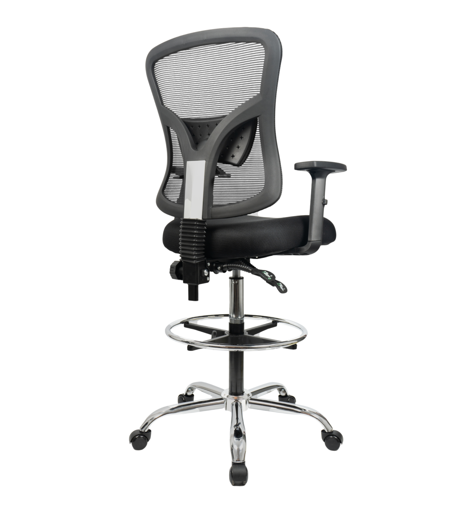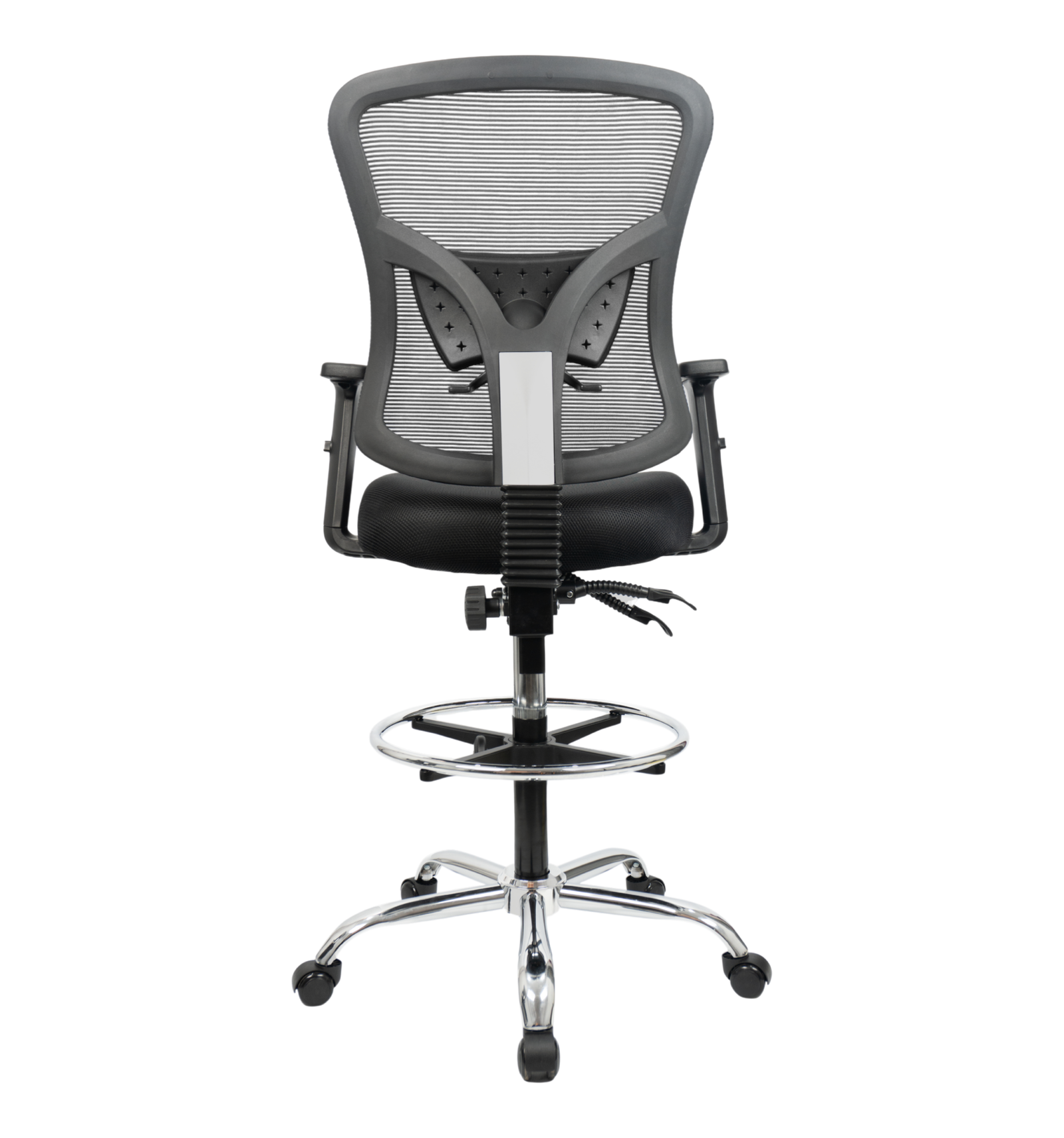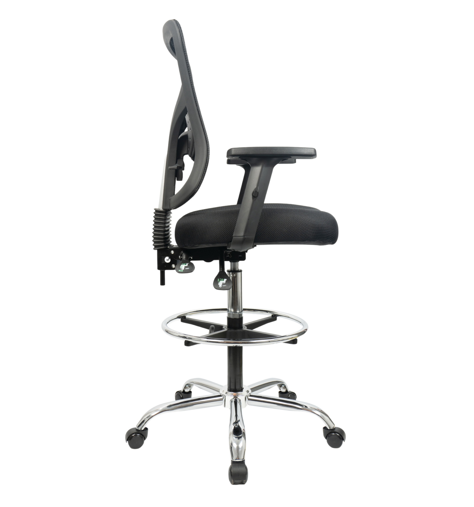 Silla con respaldo anatómico regulable en altura y con soporte lumbar regulable.